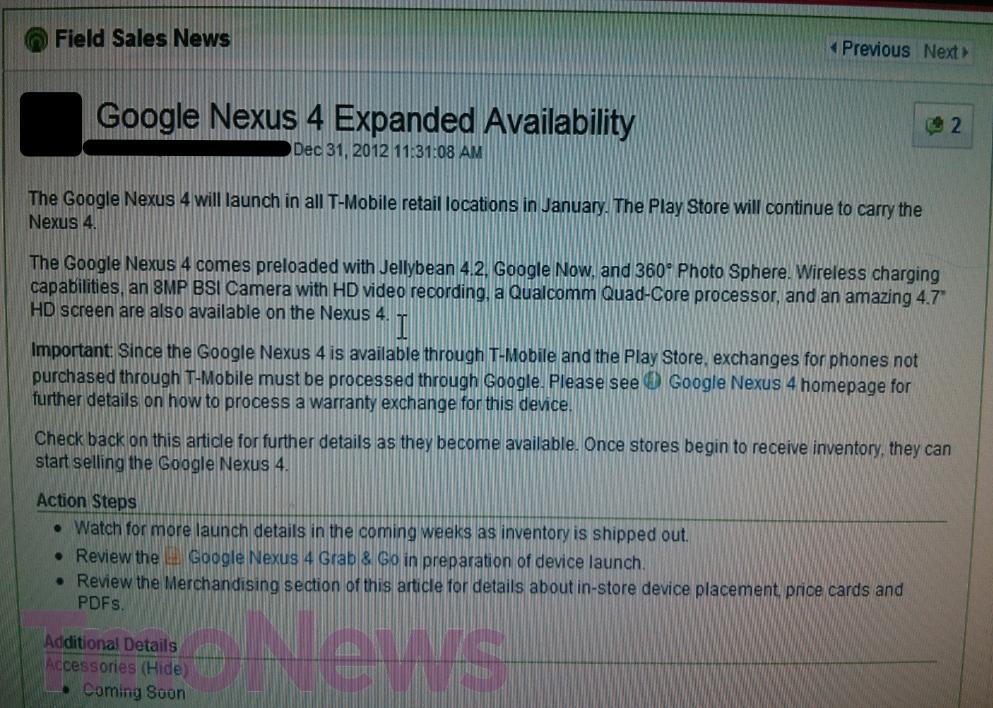 “The Google Nexus 4 will launch in all T-Mobile retail locations in January. The Play Store will continue to carry the Nexus 4.”