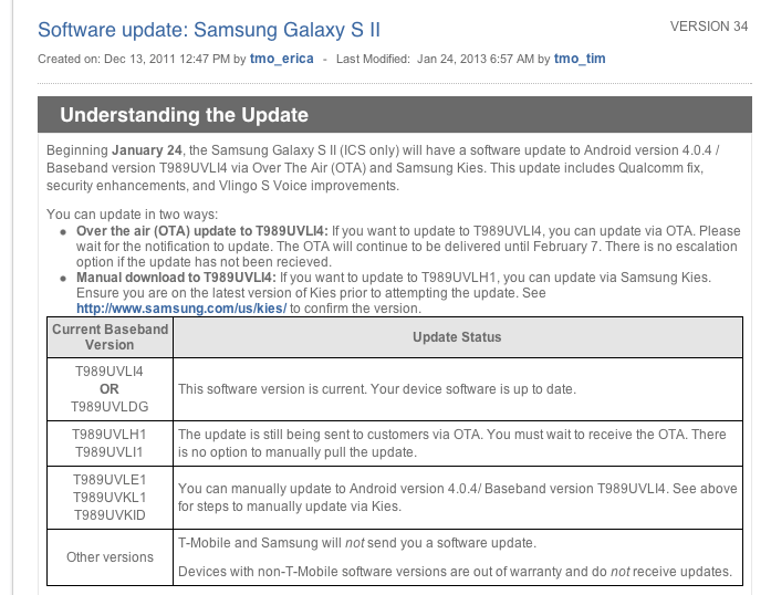 - Over the air (OTA) update to T989UVLI4: If you want to update to T989UVLI4, you can update via OTA. Please wait for the notification to update. The OTA will continue to be delivered until February 7. There is no escalation option if the update has not been received.