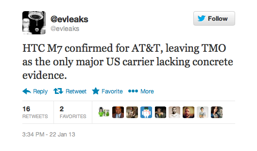 According to smartphone ninja tipster @evleaks, T-Mobile may be the only nationwide carrier to pass on the launch of HTC’s upcoming M7 handset. Let’s be clear however and add that the Twitter account only adds that there is no evidence for T-Mobile — but that doesn’t mean T-Mobile is going to be the last one standing at the dance. “Lacking evidence” isn’t a sure thing, and while its still possible T-Mobile won’t carry HTC’s newest flagship device, our focus is already on the Galaxy S IV anyway, a device we can expect T-Mobile to support.