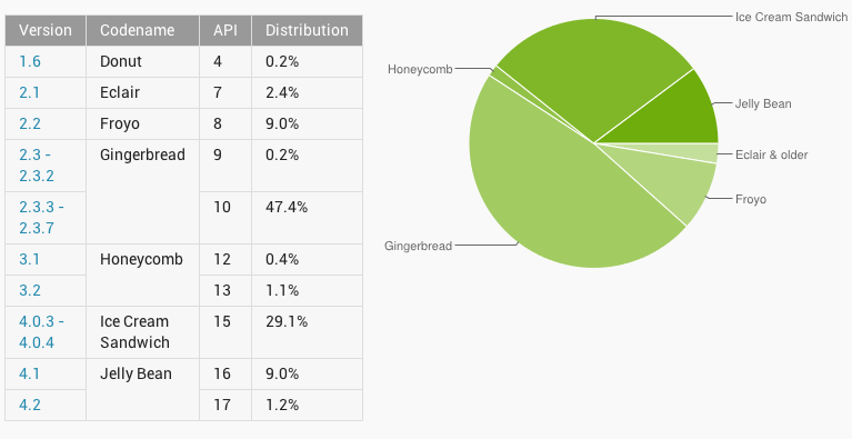 The numbers we’re focused on now is the breakdown of Jelly Bean and Android 4.1 and Android 4.2 growth. Android 4.2 only nudged a little, moving from 0.8% to 1.2%. However, Android 4.1 gained a total of 3.1% moving from 5.9% to 9.0%. We’re also happy with the drop in Gingerbread users which we hope is due to both more Ice Cream Sandwich updates releasing around the world as well as customers who are upgrading to newer Android hardware.