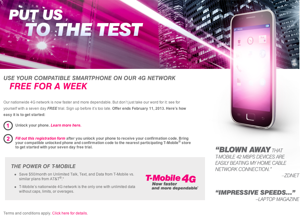 According to the T-Mobile.com landing page for this 7 day FREE trial, you must bring an unlocked device and fill out a registration form. A compatible unlocked phone is of course required and given the restrictions surrounding that now, we’ll just let you figure out how to handle that one on your own. Regardless, it’s pretty clear based on this page that T-Mobile is still eager to grab some AT&T customers and directly going after them.