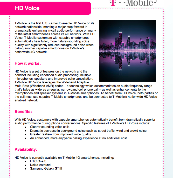 T-Mobile today announced that HD Voice is now available on its network nationwide, dramatically improving in-call voice quality for customers with capable smartphones. Customers will hear a more true-to-life voice quality that’s fuller and more natural-sounding with significantly reduced background noise from street traffic, wind and crowd noise. To experience HD Voice, both parties on the call must use capable T-Mobile 4G smartphones such as the HTC One™S, Nokia Astound and Samsung Galaxy S® III on T-Mobile’s HD Voice-enabled nationwide network. T-Mobile is the first U.S. wireless provider to launch HD Voice nationwide.