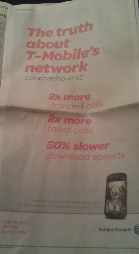 AT&T is finally taking aim at T-Mobile almost two months after the newly installed CEO of T-Mobile called the AT&T network “crap” at their keynote CES event back in early January. Responding to the claims from T-Mobile, AT&T took out a full-page attack ad in the New York Times, Wall Street Journal and USA today. The ad claims T-Mobile drops 2x the calls as AT&T as well supporting network speeds that are only half as fast as AT&T.