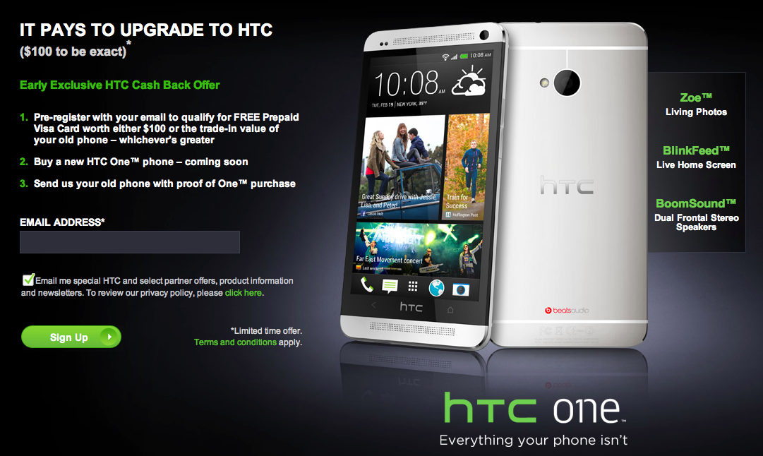 The HTC One news train continues to roll this morning with news that should interest just about anyone looking to make this their next smartphone. HTC’s “early exclusive HTC cash back offer” with the purchase of a HTC One phone in the future isn’t unlike T-Mobile’s own trade in program, but this offer is specific to the One device when it launches. All you have to do is pre-register your email to qualify and receive a prepaid Visa card worth either $100 or the trade-in value of your old phone, whichever is greater. As soon as you score your new HTC One, you’ll send the old phone in with proof or purchase and voilà, $100 Visa card. If the cost of Samsung’s flagship devices is any indication, T-Mobile’s price for the HTC One could be slightly higher than the competition (I’m just guessing, don’t quote me on that) so we’ll welcome HTC’s trade-in offer with open arms.