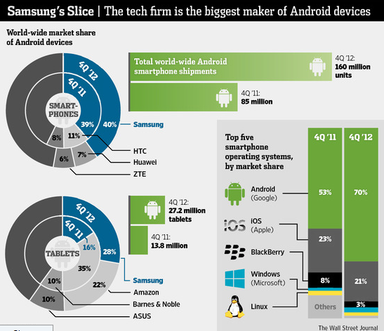 Google’s Android chief Andy Rubin has publicly praised Samsung’s success with the Android platform and their more than 213 million shipped Android devices have helped boost Google’s own mobile-ad revenue. However, Rubin is equally concerned that Samsung could become too large for Google’s own good, which is leading many to believe is the reason for Google’s pursuit of Motorola. Google’s concern isn’t unfounded as recent analytics show Samsung has grabbed 39.6% of the global Android market. Samsung’s biggest competition isn’t even another Android manufacturer, it’s Apple and their 136.8 million iPhones shipping in 2012 leading to 25.1% of the smartphone market.