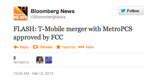 Hot on the heels of reports that the FCC would approve the T-Mobile merger at the bureau level and not a full vote — comes exactly that result. The flash just hit Bloomberg News, leaving any remaining obstacles to the merger to come from the MetroPCS shareholder meeting in April.