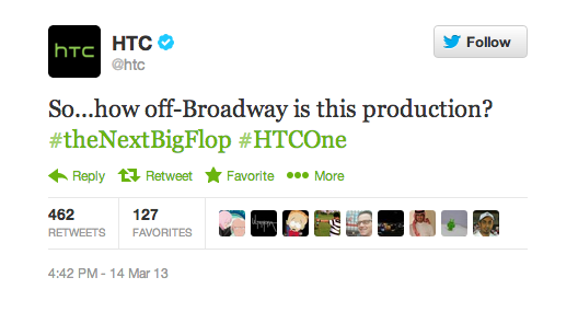 There’s going to be plenty of healthy debate in the coming weeks as to which of the two Android manufacturers has the better flagship device. Is it Samsung with the newly introduced Galaxy S 4 or HTC with the aluminum based HTC One? Well, for its part HTC isn’t wasting a moment of opportunity to take mud-slinging shots as its largest competitor as a tweet during the middle of Samsung’s Broadway style musical intro of the S 4 asked just “how off-Broadway is this production?