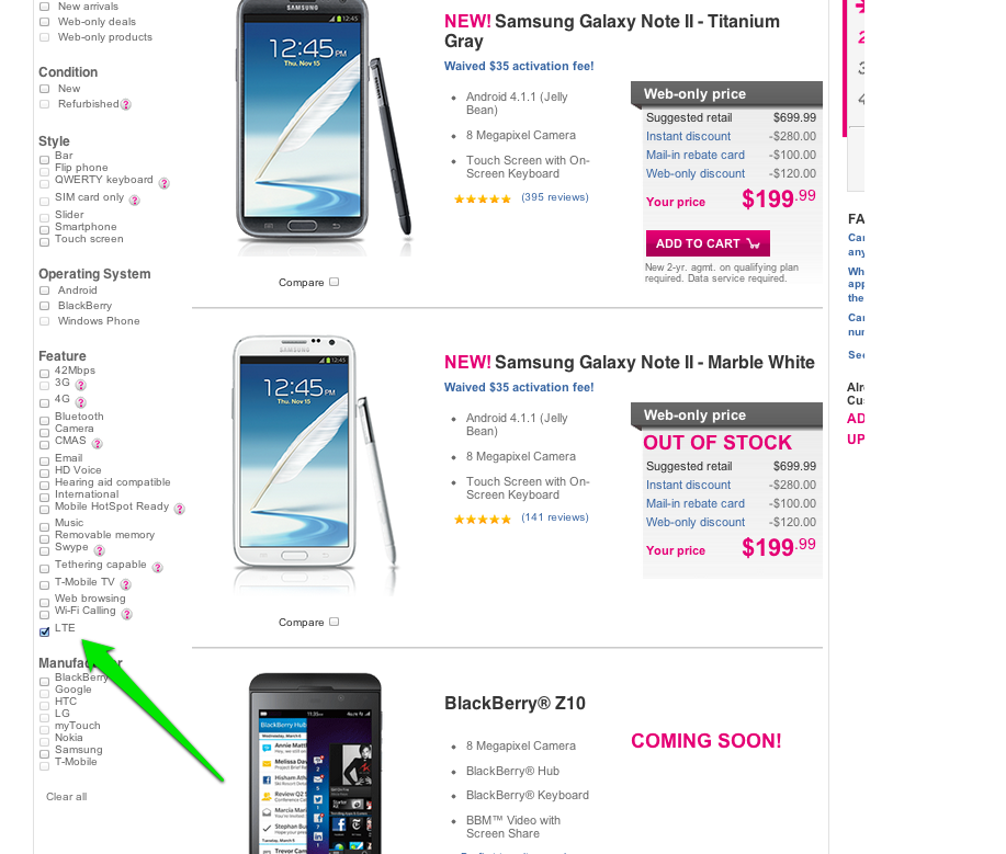 I can’t really say when an option for “LTE” was added to T-Mobile’s “Shop by” section on their website, but it’s there now. For the moment, just the Galaxy Note II and the “Coming Soon” BlackBerry Z10 show up, but ultimately we’ll see the HTC One and Galaxy S 4 grace this page. There’s really nothing else to emphasize about this option, except that it was only a matter of time that it was added and hopefully means LTE is that much closer to going live.