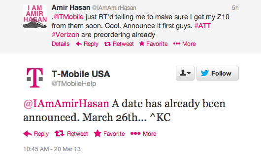 T-Mobile’s @tmobilehelp Twitter account spilled the good earlier today “announcing” that the first LTE BlackBerry, the Z10 will be available next Tuesday, March 26th. All this time we thought it would be the following day, March 27th as first discovered on a roadmap early in February. We’re perfectly happy with the device releasing one day earlier which makes perfect sense as it coincides with T-Mobile’s special media event.