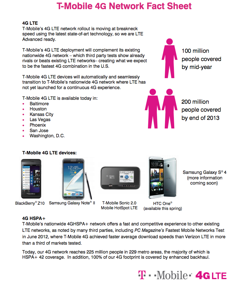 T-Mobile is deploying the latest LTE technology, paving the way to LTE Advanced. T-Mobile’s 4G LTE deployment will complement its existing nationwide 4G network — which third-party tests show rivals or beats existing LTE networks — creating what T-Mobile expects to be the fastest 4G combination in the United States. T-Mobile 4G LTE devices will automatically and seamlessly transition to T-Mobile’s nationwide 4G where LTE has not yet launched.