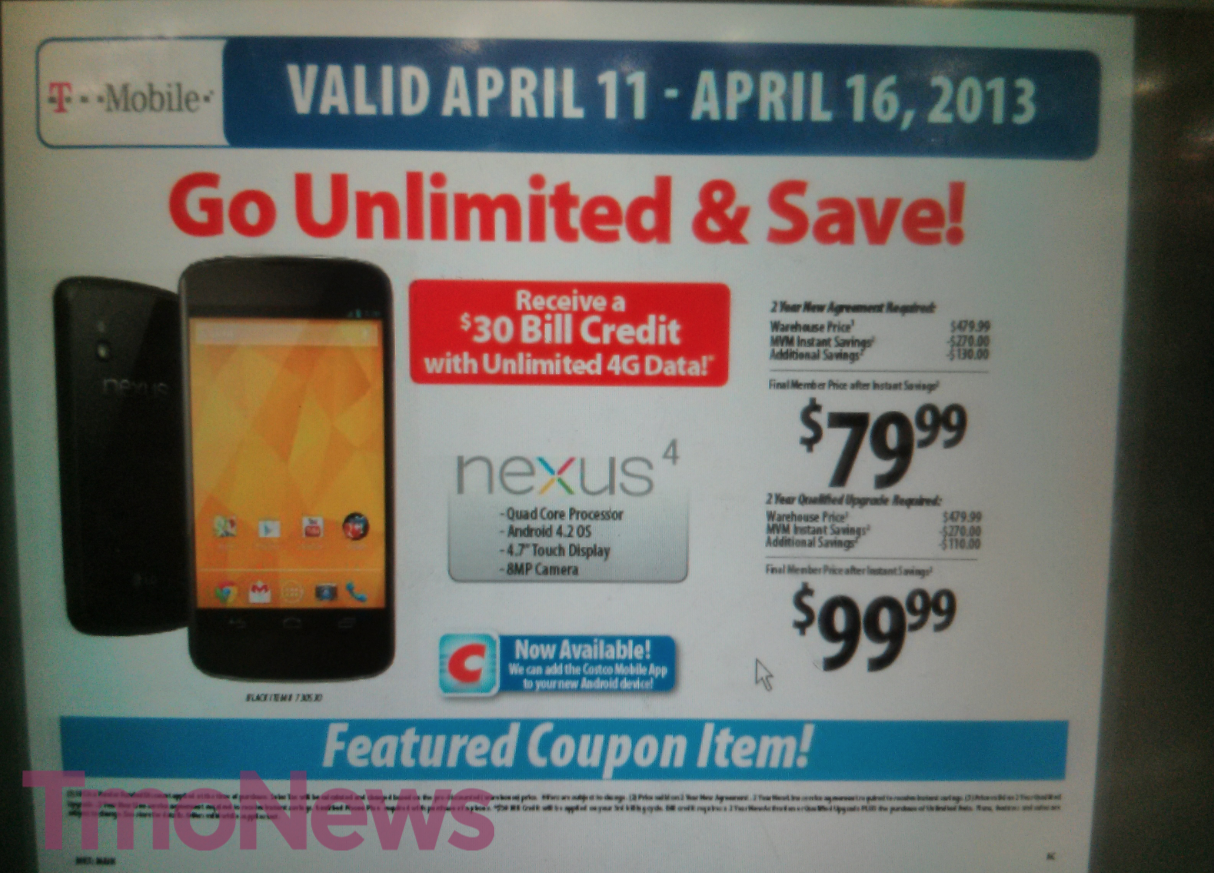 Not to be overshadowed by the trifecta launches of the iPhone 5, HTC One and Galaxy S 4 on T-Mobile, Costco is pushing an attractive offer on the Nexus 4. If bone stock Android and guaranteed first dibs at software updates is your thing, a $79 price tag for new customers or $99 for qualified upgrades may be right up your alley. As a quick reminder, as a national retailer Costco can only push the new Classic Plans and these prices apply only to Classic Plan offerings with a two-year agreement.