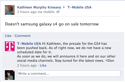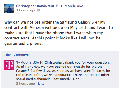 As the clock continues to tick away till midnight and the dawn of April 24th, T-Mobile’s Facebook page is telling customers tomorrow’s Galaxy S 4 online launch date has been pushed back. That launch, which T-Mobile had set for tomorrow has apparently been changed to an unknown date for unknown reasons. I’ve reached out to T-Mobile to verify the Facebook postings and will update this post as soon as we hear more.