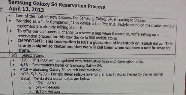 Even as T-Mobile’s CEO spoke out regarding May 1st availability for the Galaxy S 4, it’s nice to see company-owned channels won’t be the only T-Mobile outlets with stock that day. A newly leaked Staples document shows the nationwide retailer will also carry the Galaxy S 4 on May 1st, though all release dates are scheduled as “tentative.” Still, with T-Mobile’s CEO already pinpointing the 1st as a “go” date, smart money is banking on that as a concrete date.