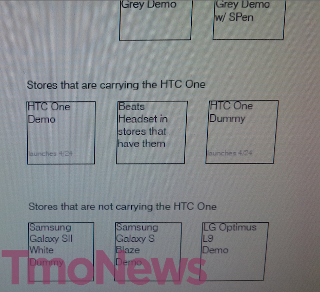 HTC One customers the T-Mobile world over have begged, hoping and wondering when the Magenta carrier would release the newest HTC flagship. Wonder no more as a newly leaked image of a T-Mobile retail store planogram hints that the sought-after device will launch on April 24th in “stores that are carrying the HTC One.” Unfortunately, that means some stores won’t be carrying the One, at least initially which is similar to how the Galaxy S III originally launched.