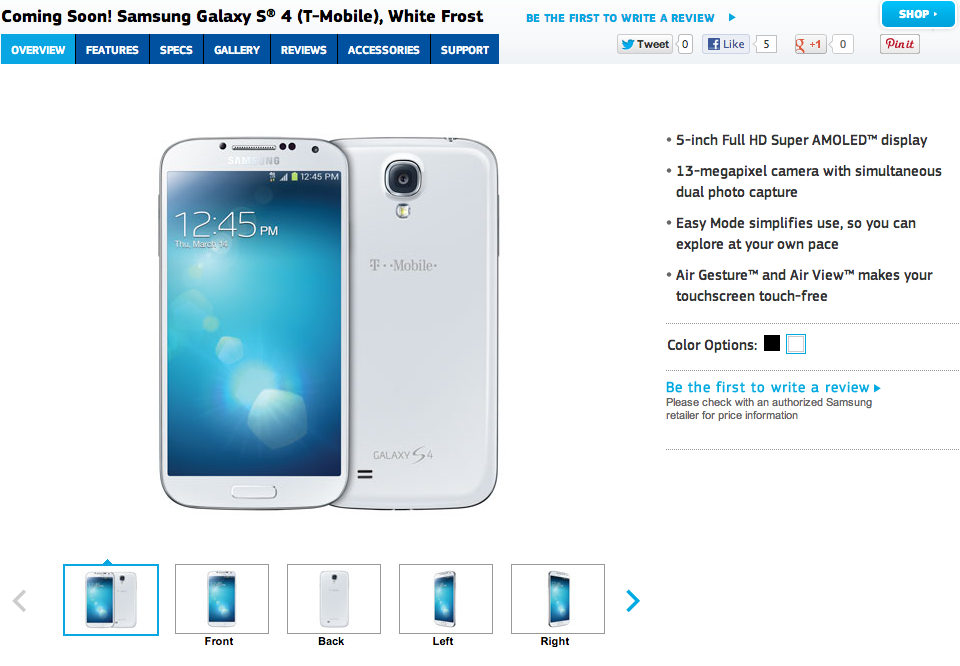 On a separate but related note, there’s still no sign of any official T-Mobile pre-order, but I just got word that Walmart will allow a 10 day hold after release on either black or white with a $25 dollar deposit for Classic Plan customers in stores. I’m working to verify that information and get some images to support it, but it seems to fall in line with previous Walmart releases so I don’t doubt it’s a pre-order option if you absolutely must make sure you have a Galaxy S 4 waiting for you.