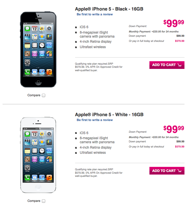 - iPhone 5 16GB = $99 down payment, 24 monthly payments of $20 totaling $579.