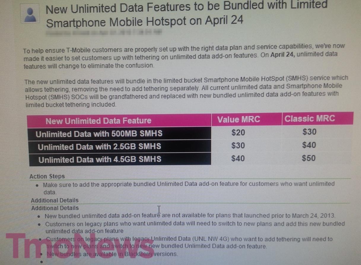 To help ensure T-Mobile customers are properly set up with the right data plan and service capabilities, we’ve now made it easier to set customers up with tethering on unlimited data add-on features. On April 24, unlimited data features will change to eliminate the confusion.