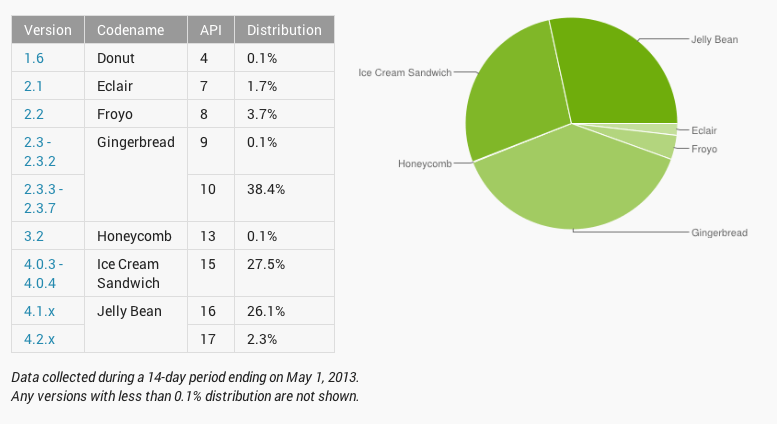 That means customers on legacy Android versions such as Gingerbread or Froyo aren’t getting updates as much as they are just upgrading to new devices. A quick reminder that as of April 2013, the distribution chart is now built using data collected based on when a device visits the Google Play Store. The good news with these distribution charts moving forward is that more than 50 percent of all Android owners are on Android 4.0 Ice Cream Sandwich and above.
