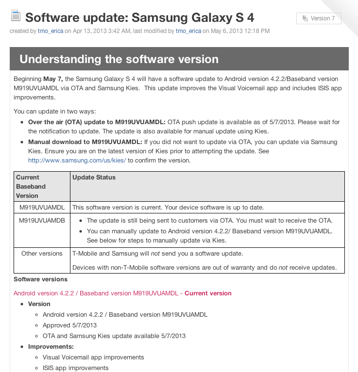 Samsung Galaxy S 4 owners should keep an eye out for a small maintenance update this morning bringing two minor updates to the recently launched flagship smartphone. According to T-Mobile’s support page, the update “improves the Visual Voicemail app and includes ISIS app improvements.” You remember Project ISIS, don’t you…that mobile payment system we’re STILL waiting to launch nationwide?