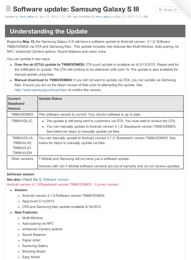 Listen up Samsung Galaxy S III owners as a software update is headed your way in the form of Android 4.1.2. There’s no hints as to what kind of changes the update brings outside of multi-window support and T-Mobile has yet to update their support page for the update. However, at least one person receiving the update noticed the inclusion of two more apps: Paper Artist and Group Play and T-Mobile’s new “4G” logo.