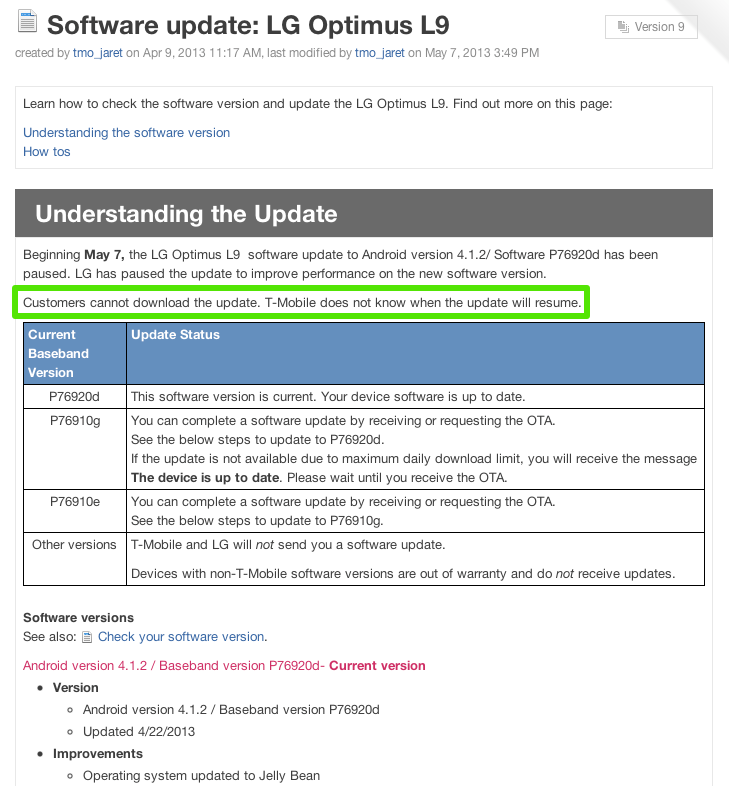 For reasons unknown T-Mobile has halted the Jelly Bean rollout for the LG Optimus L9. As of 3:50pm this afternoon, T-Mobile updated their support page for the software update with a brief statement: