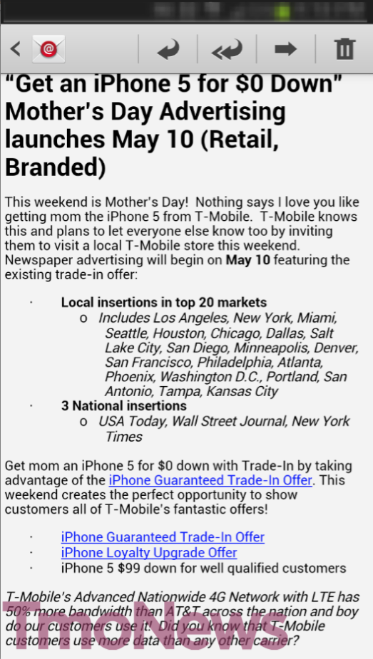 T-Mobile’s advertising for Mother’s Day weekend will focus heavily on the iPhone 5 and the trade-in promotion that has been ongoing since April 12th. That advertising itself will see three national newspaper insertions as well as papers in the top 20 markets. The offer allows both new and existing qualified customers to trade-in an iPhone 4 or 4S and receive a trade-in amount that helps wipe out the down payment on the iPhone 5. The result being a “$0 down” net payment for customers and a decreased monthly payment of $15, down from $20 saving the customer $5 per month.