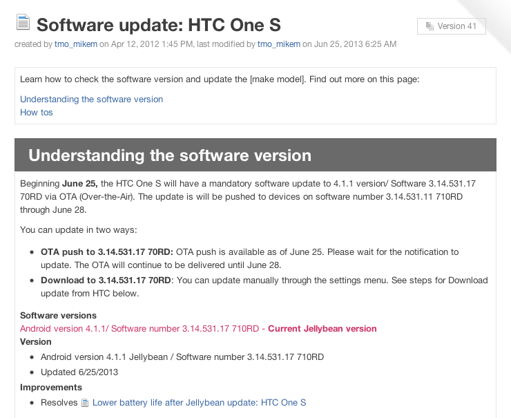HTC One S owners take note as a new software update is rolling out in hopes of resolving the battery life issues that have plagued users in a post-Jelly bean update world. After the Android 4.1 Jelly Bean update, HTC One S owners en masse noticed battery life depleted faster than normal. T-Mobile’s support page notes that Wi-Fi calling may have been partly responsible, however a May 4th posting here on TmoNews saw a number of fingers pointed in the direction of GPS.