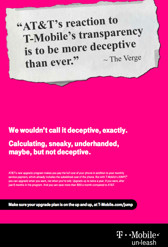 T-Mobile’s not laying down on hitting at AT&T’s early upgrade program even after T-Mobile’s CEO takes a series of shots on Twitter. In a new ad that is set to run in USA Today tomorrow, T-Mobile takes a swing at AT&T’s “calculating, sneaky, underhanded but not deceptive” early upgrade program. I’d call it deceptive and I’d say that AT&T must have the best accountants to earth to try to spin their plan and make it seem as thought it benefits their customer base by paying both the subsidy price tucked into your rate plan and then a monthly installment.