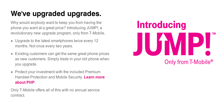 We’ve already covered T-Mobile’s JUMP! upgrade program in in great detail and there’s already some existing stories on the blog for your reading pleasure including a basic background of JUMP! and whether or not the right program for you. You can find JUMP! fully detailed in the launch post from July 10th or watch T-Mobile CEO John Legere explain the meaning behind the program in the video clip below. So, is JUMP! a good deal? Well, that depends on a number of factors, including when you use it, an idea I expanded on in a mini-editorial that can be found here. Regardless of whether JUMP! is right for you or not, we can’t avoid that it’s a completely unique program and while its success may not be known for some time, T-Mobile is trying things outside the “standard wireless carrier” box and that’s why we love our little carrier that could.