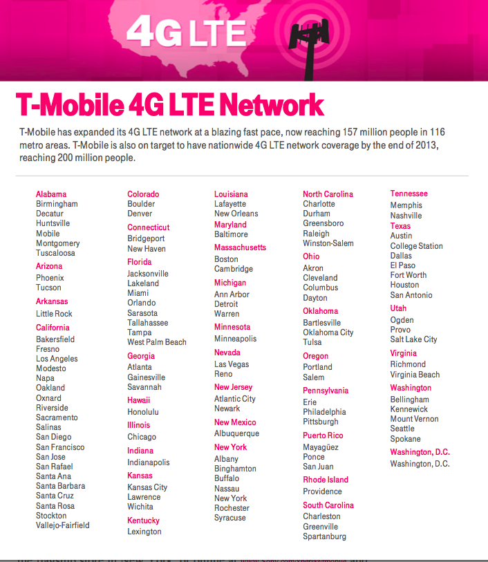 Major metropolitan areas where T-Mobile’s 4G LTE network service has launched include New York, Los Angeles, San Francisco, Chicago, Boston, Philadelphia, Dallas, Seattle, Atlanta, Miami, and many others. The company debuted 4G LTE less than four months ago.