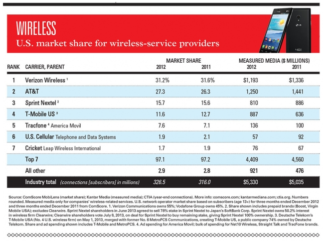 When considering ad spending against market share in 2012, T-Mobile spent 636 million in 2011 with 12.7 percent market share against 11.6 percent in 2012 and 887 million in ad spending. Now, even as the company spends more, their market share has decreased.