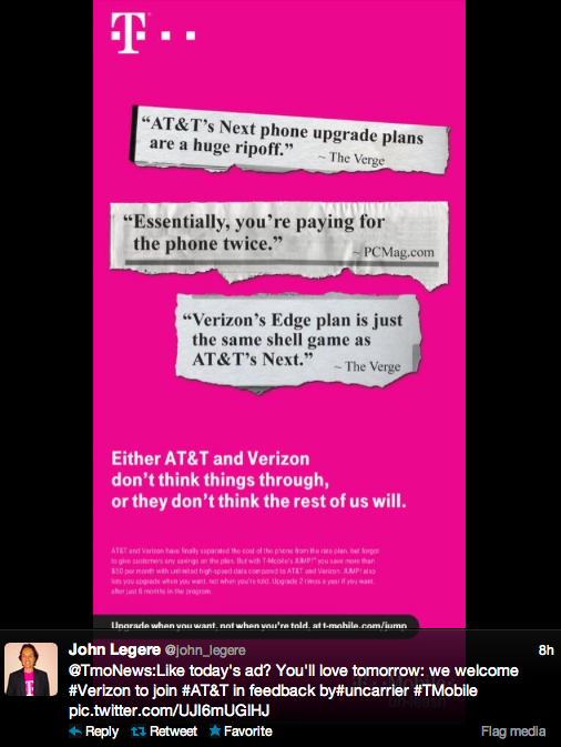 Aside from the fact that T-Mobile CEO John Legere directly tweeted this to me which makes me feel all kinds of appreciated this morning, it’s another great ad. The follow up to Monday’s attack on AT&T now lumps Verizon’s upcoming Edge plan in the the same aggressive boat as AT&T’s Next upgrade plan.