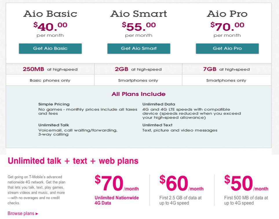 Aio makes wireless easy with a friendly in-store and online experience and three simple plans to choose from. All three plans include unlimited talk, text, and data-with a pre-established amount of high-speed access, including 4G LTE. Plans range from $40 to $70 per month, with taxes and fees included.
