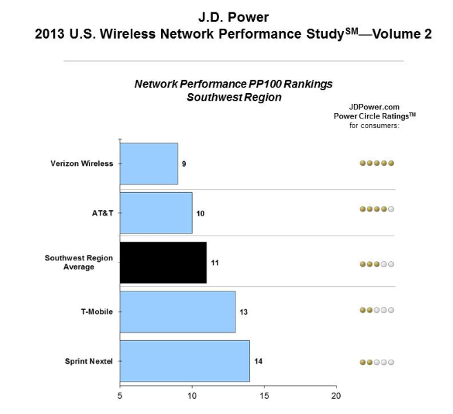 The last of the second volume of JD Power reports for 2013 has just arrived and needless to say, it’s a mixed message for T-Mobile. The Wireless Network Quality semi-annual Performance Study “evaluates wireless customers’ most recent usage activities in three areas that impact network performance: calling, messaging and data. Overall network performance is based on 10 problem areas that impact the customer experience: dropped calls; calls not connected; audio issues; failed/late voicemails; lost calls; text transmission failures; late text message notifications; Web connection errors; slow downloads; and email connection errors. Network performance issues are measured as problems per 100 (PP100) network connections, with a lower score reflecting fewer problems and better network performance. Carrier performance is examined in six geographic regions: Northeast, Mid-Atlantic, Southeast, North Central, Southwest and West.”