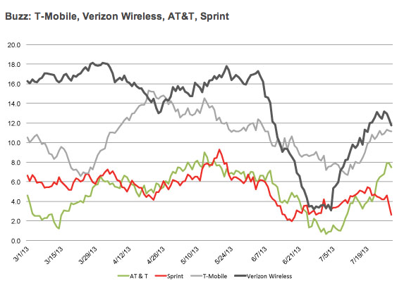 T-Mobile’s brand perception began to creep up immediately following T-Mobile CEO debuted the company’s new branding in a profanity filled speech last March. T-Mobile’s Buzz score doubled from less than 7 points before the announcement to about 15 points in mid-April when it knocked Verizon off the top spot. Verizon recovered quickly but nose-dived in June followed the revelation it provided customer information to the NSA. Bad Verizon, bad.