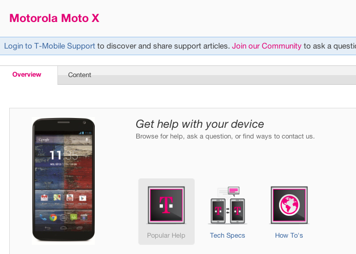 We’re still eagerly awaiting any kind of launch details to officially drop from T-Mobile surrounding the Moto X launch, but until then we’ve got a newly posted support page. For the most part, it’s just a placeholder now and I really don’t expect anything on the launch to be posted in this section, but it makes me hopeful T-Mobile might say something soon.