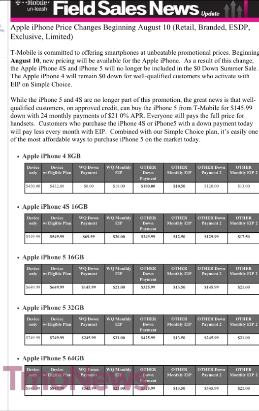 Coming off of yesterdays high with T-Mobile’s best quarterly financial results in years is some news that will surely disappoint some future iPhone buyers. Beginning tomorrow, August 10th T-Mobile will remove the iPhone 5, iPhone 4S and from their $0 Down Summer Sale. Unfortunately, no reason is given for the move, and the leaked images don’t offer any reasoning for the price change. As it stands, the iPhone 5 will return to its earlier price point of $145.99 down with 24 monthly payments of $21.