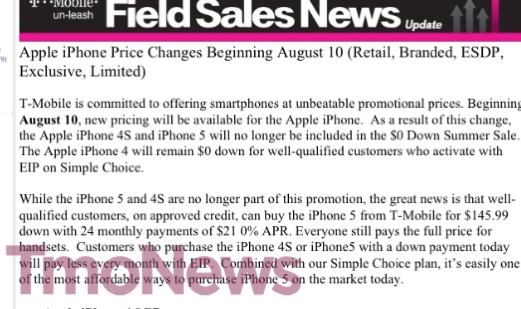 Coming off of yesterdays high with T-Mobile’s best quarterly financial results in years is some news that will surely disappoint some future iPhone buyers. Beginning tomorrow, August 10th T-Mobile will remove the iPhone 5, iPhone 4S and from their $0 Down Summer Sale. Unfortunately, no reason is given for the move, and the leaked images don’t offer any reasoning for the price change. As it stands, the iPhone 5 will return to its earlier price point of $145.99 down with 24 monthly payments of $21.