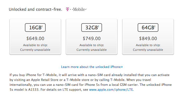 We can make some pretty educated guesses at how much T-Mobile will want down on the iPhone 5C with the 16GB model priced at $549 and the 32GB model priced at $649. The iPhone 5S in 16/32/64GB variants will cost $649/$749/$849 respectively. It seems likely the iPhone 5S will carry the same pricing as the iPhone 5 does today, $145.99 down and $21 per month for 24 months. I’m also thinking the iPhone 5C could run $99.99 down and $15 a month or something thereabouts. I hope we find out exactly what T-Mobile has in-store price wise in the very near future.