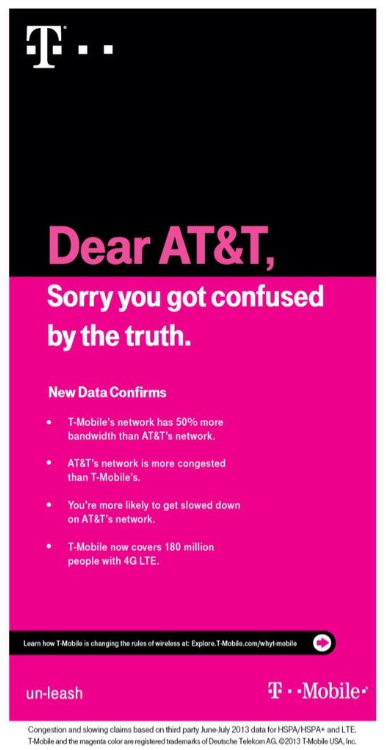 Is picking a fight with AT&T the best move for T-Mobile? That’s an argument for another day, but clearly the company is continuing to downplay the NDA “wrist-slap” and the nitpicking verbiage AT&T took issue with. T-Mobile’s execs said in no uncertain terms yesterday that they won’t make “any substantial changes to our marketing claims” and as this image shows, they meant it.