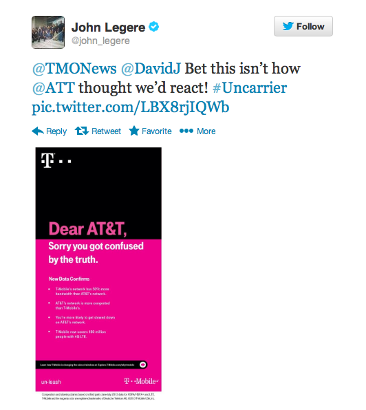 If anyone actually thought T-Mobile CEO John Legere would take the AT&T/National Advertising Division rebuke lying down, well…we’re just going to call you silly. Taking the NDA findings lying down is exactly the opposite of what T-Mobile and their boisterous CEO will do. In fact, Legere dropped this image off to me on Twitter boasting how he is reacting in a way AT&T likely never expected. AT&T may not have expected it, but if you’ve followed the Magenta CEO on Twitter for any length of time, you expected this type of response without question.