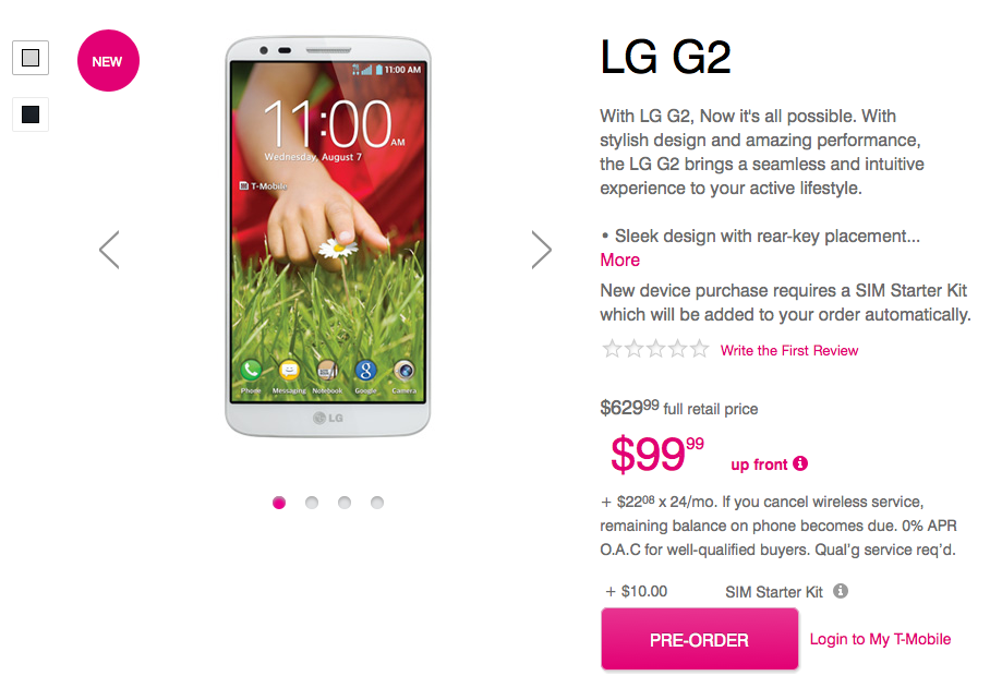 The LG G2, which features a 5.2″ Full HD display, 13 megapixel camera, and rear-key functionality will go up for pre-order online beginning September 18th. The device will hit T-Mobile retail stores, select dealers and national retail sores on September 25th. Through T-Mobile’s Simple Choice plan, the G2 will cost “well-qualified” buyers $99 down with 24 monthly installments of $21. The G2 will be offered in both black and white finishes, with the latter only being offered online.