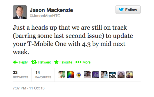 Earlier this month HTC teased the masses with a tweet on the Android 4.3 update for their flagship HTC One. The tweet, posted on October 2nd offered up a mid-October date for T-Mobile and now HTC is ready to make good on that timeframe. A tweet late yesterday from HTC America President Jason Mackenzie stated the T-Mobile update should release “by mid next week.” Of course Mackenzie prefaced that with a warning: “barring some last second issue” which makes perfect sense. We all know that last second hiccups can happen with updates so the comment isn’t any cause for concern.