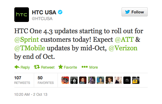 In a move that will hopefully appease HTC One owners across the nations four largest carriers, HTC’s official US Twitter account recently “announced” a time-frame for the Android 4.3 update. According to the tweet, HTC One owners on T-Mobile can expect to see the update sometime around mid-October. There’s no specific date, but at least mid-October provides a specific time-frame to ease the frustrations of HTC One owners that have been left wanting some sort of news regarding a date. According to The Verge, the update will “include lock screen widgets, numeric battery levels in the status bar, a quick settings panel in the notification bar, options to configure the home button, improvements to the camera, and an easier to manage file format for Zoe clips.”