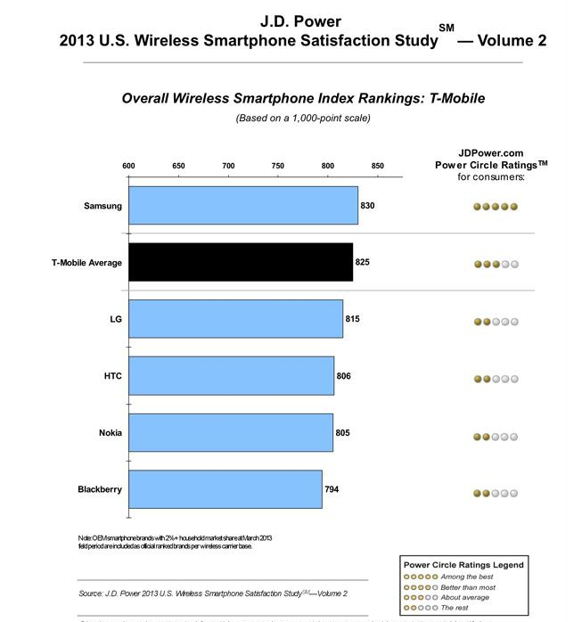 Finally, a JD Power poll for T-Mobile that doesn’t show the carrier in last place! All sarcasm aside, the new second volume of the US Wireless Smartphone Satisfaction Study results are in and Samsung takes the top honors on T-Mobile’s network. Overall satisfaction for smartphone devices on T-Mobile ranks them third behind AT&T and Sprint customers, but before Verizon.