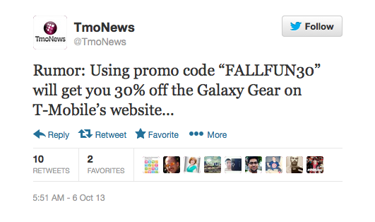 If you’re looking to score a Galaxy Gear with your Samsung Galaxy Note 3 purchase, please take “note” of this post. Thanks to TmoNews reader “JW” who notified me that using promo code “FALLFUN30” knocks 30% off the retail price. The promo code takes the cost of the Galaxy Gear all the way down to $209.99. This deal only appears to work on T-Mobile’s website and there’s no telling how long it’ll stay good for. Now that it’s out in the open, time may be limited…so if you’re wavering back and forth about purchasing, there’s no time like the present.