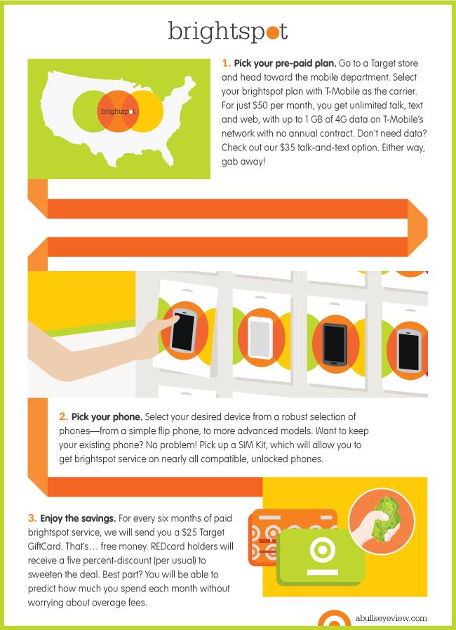 We know guests are looking for customizable and convenient mobile plans that won’t break the bank. Starting Oct. 6, Target will offer guests more options and flexibility with brightspot, the Bullseye’s fresh, new mobile program. brightspot brings together the mobile phone plans you want with the devices you desire.