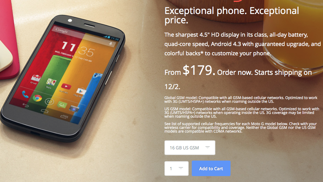 You can order the Moto G from today, and expect shipping any time from December 2nd. 8GB model costs just $179 off-contract and the 16GB version will set you back $199. Both are stupidly good value for money, even if it is without LTE.