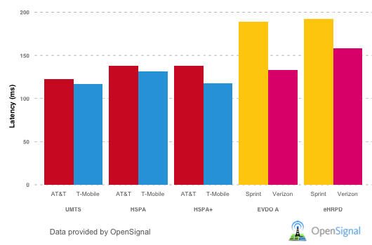 With that in mind, we should take a look at a couple of the results. Firstly, LTE. Open Source tested latency on each of the four carriers. In this test, T-Mobile performed best, and was the only network to achieve results below 90ms. (You’ll have to forgive the obviously poor choice in color co-ordination.)