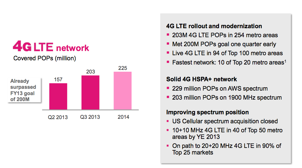 Screen Shot 2013-11-05 at 14.49.09By the end of this year, 10+10 LTE will be in 40 of the top 50 metro areas. For reference, Tmo stated that speeds on this network were around 72Mbps downloads and 20Mbps up. May sound great, but, that’s not where it ends. Next year its 20+20 rollout will be kicking in to high gear and will be in 90% of the top 25 markets offering around 147Mbps down and 40Mbps uploads. HSPA+ in both AWS and 1900MHz spectrums are strong with each approaching national level coverage. And, with U.S. Cellular spectrum purchased in the Mississippi area, it’s growing well.